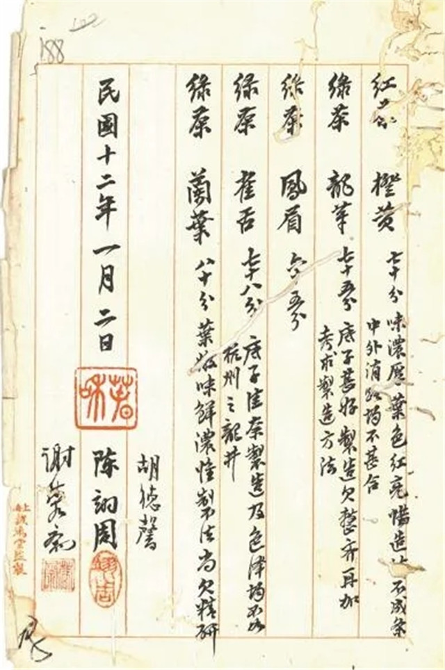 1922年11月,朱文精將實習(xí)所焙制的5種茶樣交實業(yè)司,轉(zhuǎn)送上??偵虝诱垖<以u定。擔(dān)任上??偵虝褂[會茶葉審查員的胡德馨、陳翊周、謝蓉齋3位茶業(yè)專家在詳細查驗品評茶樣后,聯(lián)合出具了報告書。報告書記載,5份茶樣,合紅茶1份,綠茶4份,分別是橙黃、龍華、鳳眉、雀舌、蘭葉。其中蘭葉“葉嫩味鮮濃”得分最高,獲得80分??傮w來看,專家們認(rèn)為茶業(yè)實習(xí)所送評的茶葉,無論紅茶還是綠茶,茶葉的底子都好,但制法上尚欠精研,還需提高。