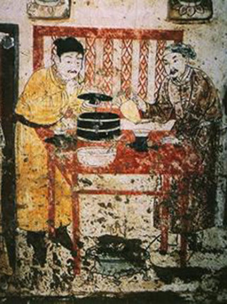 見(jiàn)于河北宣化下八里村6號(hào)墓遼代壁畫(huà)。壁畫(huà)中共有6人,一人碾茶,一人煮水,一人點(diǎn)茶,反映了當(dāng)時(shí)的煮茶情景。