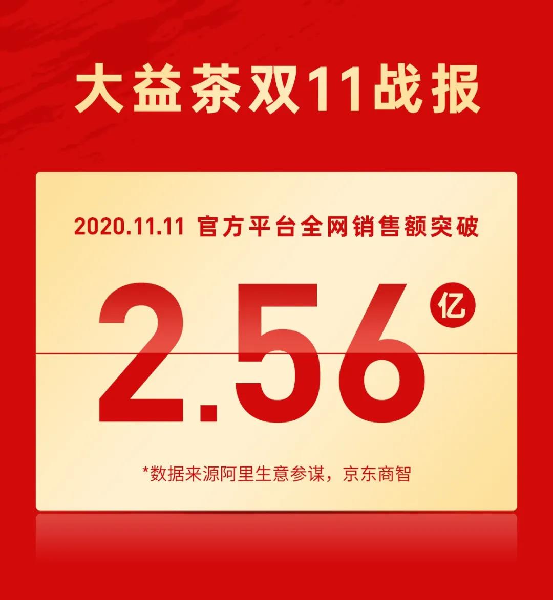 11月11日零點,本年度雙11“大戰(zhàn)”結束,大益各項“戰(zhàn)績”出爐,再次刷新茶行業(yè)里程碑式記錄,大益茶官方平臺全網銷售額突破2.56億。其中,天貓大益茶葉旗艦店銷售總額超2.01億,大益榮登茶行業(yè)銷售六連冠。
