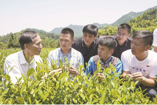 省級非遺傳承人李賢葆(左一)向朱遠志(左四)講授舒城小蘭花茶葉的種植、管理技術。張永攝