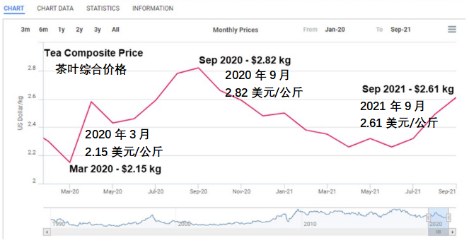 從產(chǎn)茶區(qū)域來(lái)看,茶葉價(jià)格趨勢(shì)喜憂參半。印度茶葉產(chǎn)量占到全球的20%。2021年9月份,印度茶葉出口量下降10%,但出口金額上漲。印度報(bào)告稱,在疫情爆發(fā)的一年里,印度本土茶葉價(jià)格下跌, 2021年上半年價(jià)格上漲。11月,加爾各答的紅碎茶拍賣(mài)價(jià)格降至2.78美元/公斤,2020 年同期為2.97美元/公斤。