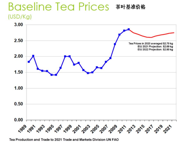 經(jīng)濟(jì)學(xué)人智庫(kù)(EIU)估計(jì)茶葉價(jià)格將上漲至接近長(zhǎng)期平均水平,“我們預(yù)計(jì),因?yàn)楣┎粦?yīng)求,加上一些市場(chǎng)(特別是歐洲和北美)的茶葉需求逐漸復(fù)蘇,2021年剩余時(shí)間茶葉價(jià)格會(huì)穩(wěn)中有升。我們估計(jì)2021年全年平均價(jià)格為2.69美元/公斤,比 2020 年下降 0.5%。2022年茶葉均價(jià)將上漲 8.7%,至2.92 美元/公斤。”