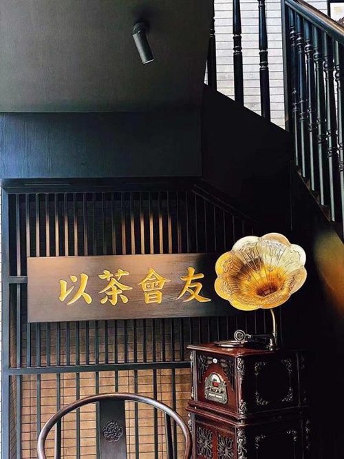 以茶會友的金字招牌上書“以茶會友”招徠過往賓客,配上傳統(tǒng)八仙桌與復(fù)古留聲機(jī)。在這個空間中喜茶靈感與廣式茶樓印象交融,傳統(tǒng)元素在打散重組中收獲新意。