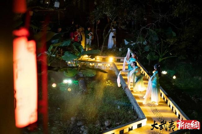 中秋之夜,月滿情濃。武夷山宋街景區(qū)內,流光溢彩,人流如織。吃茶、聽曲、猜燈謎......伴隨著古街內的典雅的古琴聲“宋風當潮 · 武夷月夕”活動擺茶開席,歌舞秀+民俗表演,將歷史上武夷山中秋夜民間祭月的場景予以復原,讓現(xiàn)場游人穿越時空,感受傳統(tǒng)中秋的賞月民俗。