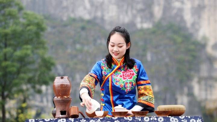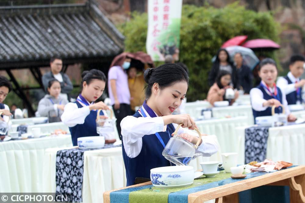 以上圖片:茶藝師在重慶市黔江區(qū)城市大峽谷景區(qū)表演茶藝。CICPHOTO/楊敏 攝